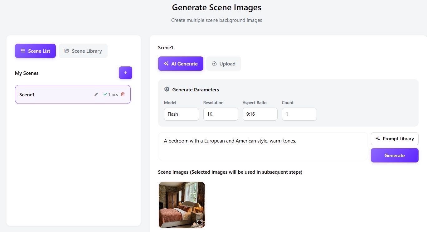 Example Prompt: "A warm-toned, modern European-style bedroom." This ensures your product exists in a space that matches your brand aesthetics perfectly.