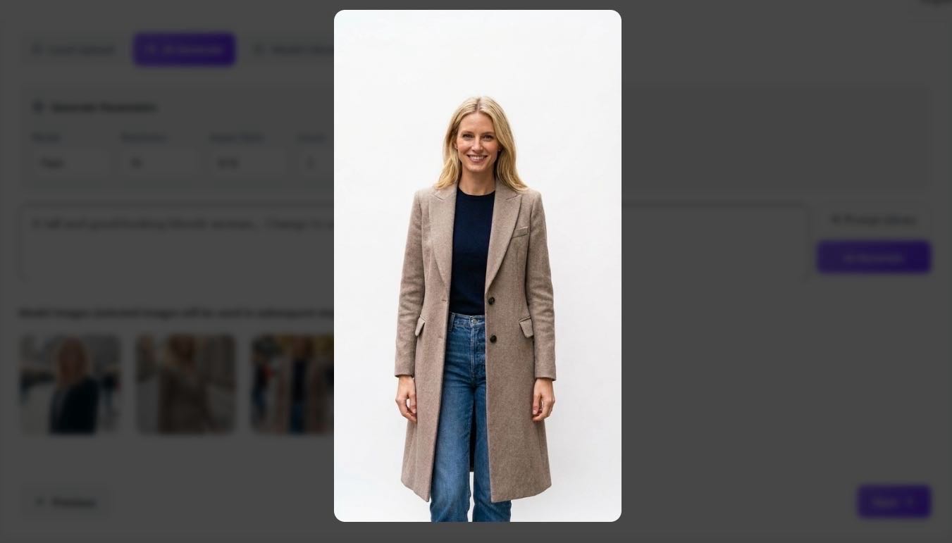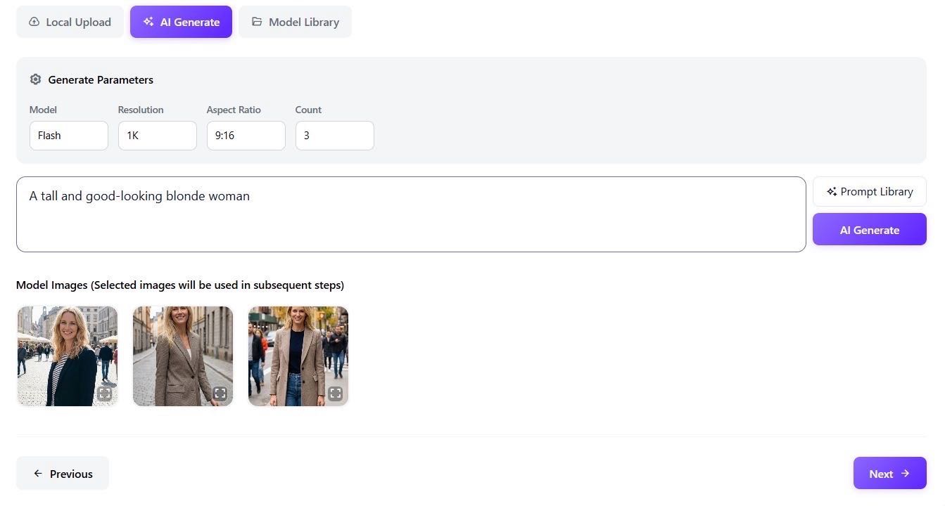 AI Generation: Don't have a model? Describe your ideal persona. Use prompts like "A blonde woman with a fit physique" or "A charismatic Black man facing the camera."