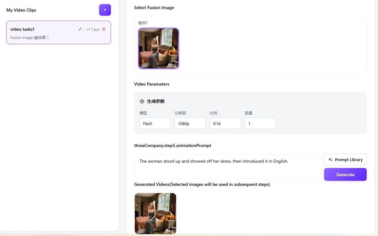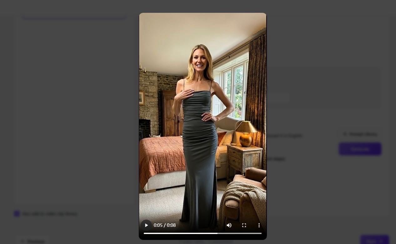 Prompt: "The woman stands up to showcase the dress and begins introducing it in English." Our engine interprets the physics and fabric movement to create a natural, high-definition video clip.