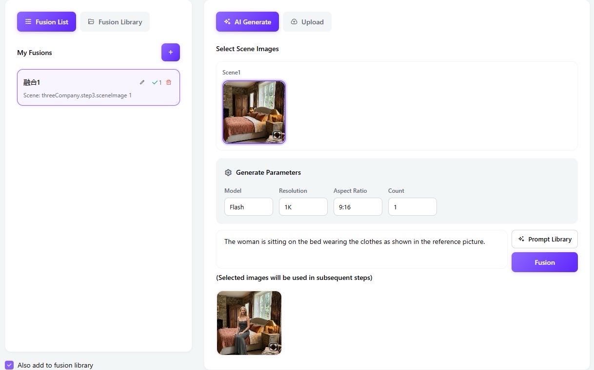 Prompt: "The woman is sitting on the edge of the bed wearing the dress from the reference photo." Temvideo will merge these elements into a seamless, high-quality static composition.
